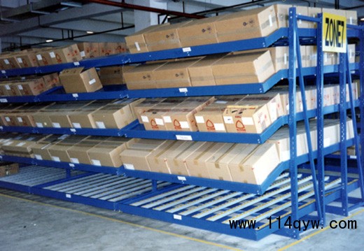 是將貨物置于滾輪上,利用一邊通道存貨,另一邊通道取貨。料架朝出貨方向向下傾斜,貨物在重力作用下向下滑動。
