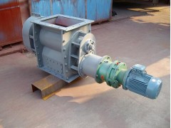 當變速機由蝸桿付通過裝在同一主軸上的刮板,供給葉輪和測量葉輪現實給粉。煤粉自煤粉流入給料機上部體內的隔板上及其缺口下面的供給葉輪的齒槽內,旋轉的葉輪帶著煤粉在供給葉輪的齒槽內,旋轉的葉輪帶著煤粉在供給葉輪殼內轉180度給葉輪殼缺口處,落到測量葉輪內的齒槽,測量葉輪再轉180度又把煤粉帶部體內的片,煤粉既落入出粉管中,按此過程就達到連續、均勻給料防止停機時煤粉自流的目的。