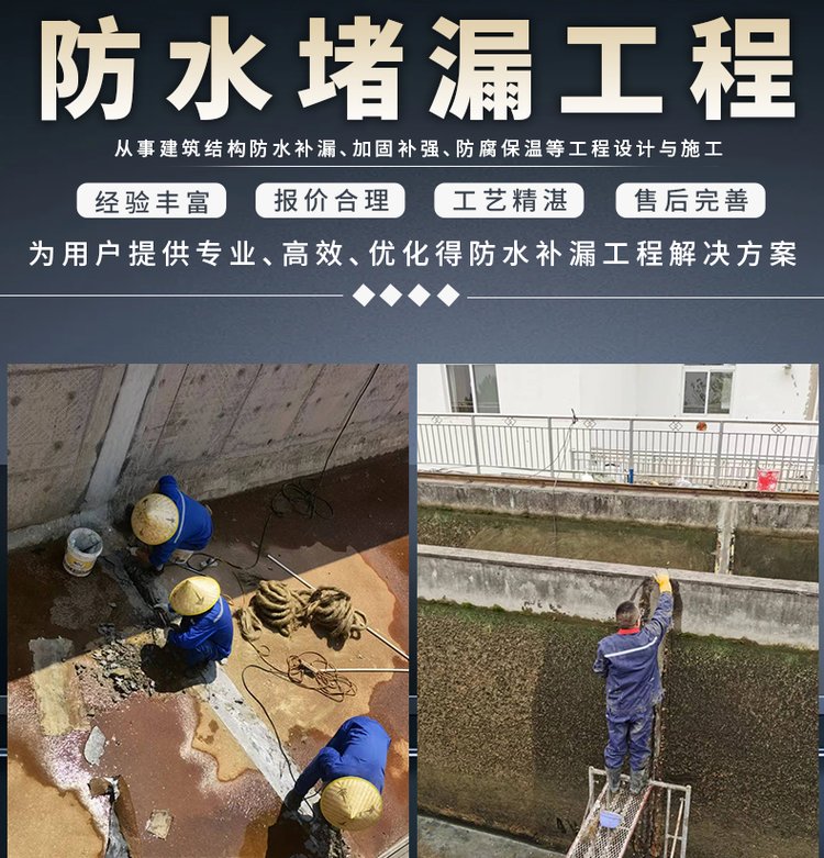 此前,該公司的輸煤棧橋出現了嚴重的滲漏水情況,導致,經防水工程部王經理對現場的踏勘情況發現:由于長時間的工作運行和自然因素,輸煤棧橋C3、C4廊道澆筑工序不合格,頂板漏水,并且伸縮縫處有漏水情況。根據《尾工協調會基建遺留缺陷需協調解決問題清單》 。我防水公司根據土建專業第六條與現場實際滲漏水情況,結合多年施工經驗,為該工程量身打造了一套專業堵漏施工方案,簽訂堵漏施工合同。污水池止水帶帶水補漏 水池堵漏施工方法鹽城市之睿祥防水堵漏工程有限公司污水池伸縮縫堵漏修復方案為了防止溫度變化引起的熱脹冷縮引起的建筑裂縫,在建造化工水池時,設置了伸縮縫。在使用化工水池使用過程中,會出現一些問題,如處理不當導致水池伸縮縫滲漏,影響整個工程的質量。因此,作為化工水池防
